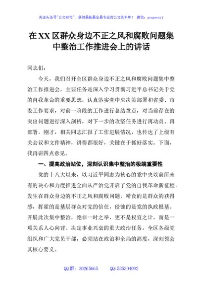 / 在XX区群众身边不正之风和腐败问题集中整治工作推进会上的讲话