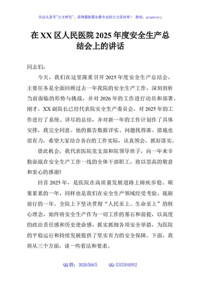 / 在XX区人民医院2025年度安全生产总结会上的讲话
