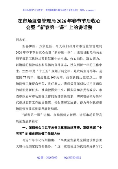 / 在市场监督管理局2026年春节节后收心会暨“新春第一课”上的讲话稿