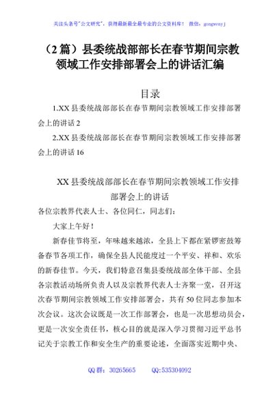 / (2篇)县委统战部部长在春节期间宗教领域工作安排部署会上的讲话汇编