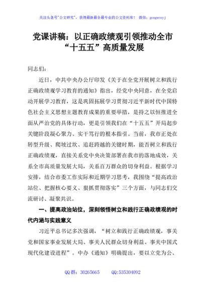 / 党课讲稿:以正确政绩观引领推动全市“十五五”高质量发展