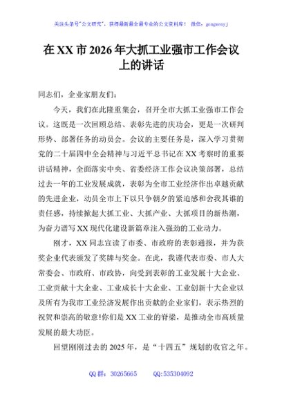 / 在XX市2026年大抓工业强市工作会议上的讲话