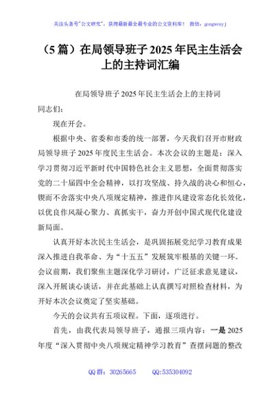 / (5篇)在局领导班子2025年民主生活会上的主持词汇编