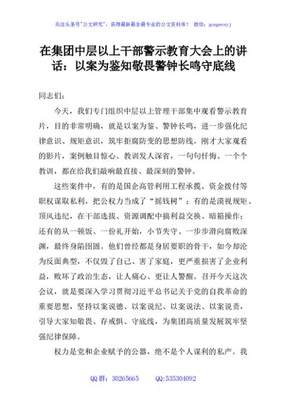 / 在集团中层以上干部警示教育大会上的讲话:以案为鉴知敬畏警钟长鸣守底线