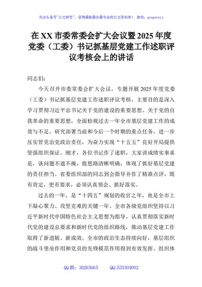 / 在XX市委常委会扩大会议暨2025年度党委(工委)书记抓基层党建工作述职评议考核会上的讲话