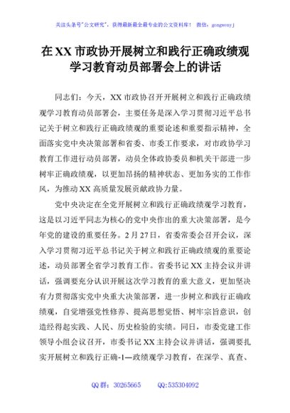 / 在XX市政协开展树立和践行正确政绩观学习教育动员部署会上的讲话