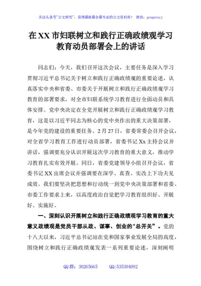 / 在XX市妇联树立和践行正确政绩观学习教育动员部署会上的讲话