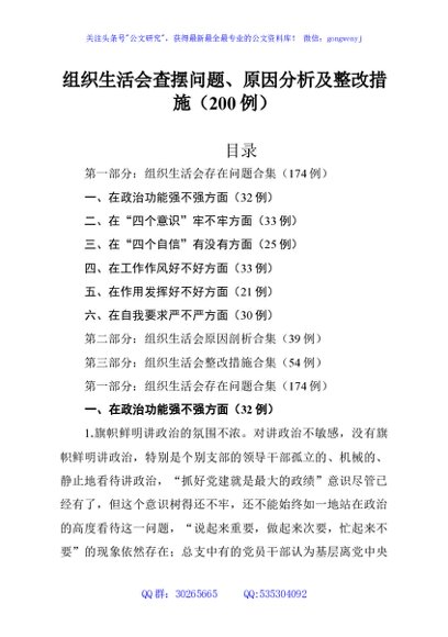 / 组织生活会查摆问题、原因分析及整改措施(200例)