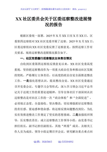 / XX社区委员会关于区委巡察整改进展情况的报告