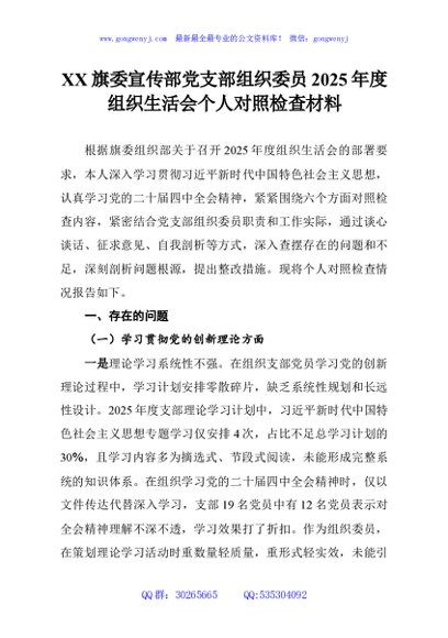 / XX旗委宣传部党支部组织委员2025年度组织生活会个人对照检查材料