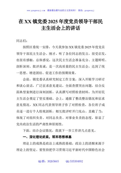 / 在XX镇党委2025年度党员领导干部民主生活会上的讲话