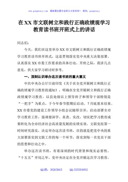 / 在XX市文联树立和践行正确政绩观学习教育读书班开班式上的讲话