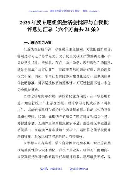 / 2025年度专题组织生活会批评与自我批评意见汇总(六个方面共24条)