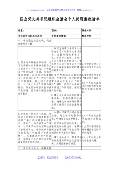 / 国企党支部书记组织生活会个人问题整改清单