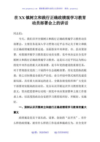 / 在XX镇树立和践行正确政绩观学习教育动员部署会上的讲话