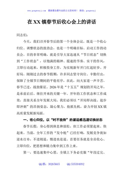 / 在XX镇春节后收心会上的讲话