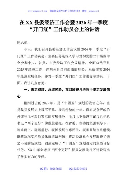 / 在XX县委经济工作会暨2026年一季度“开门红”工作动员会上的讲话