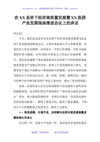 / 在XX县林下经济高质量发展暨XX医药产业发展现场推进会议上的讲话