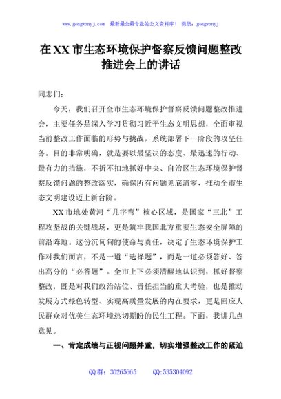 / 在XX市生态环境保护督察反馈问题整改推进会上的讲话