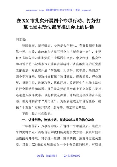 / 在XX市扎实开展四个专项行动、打好打赢七场主动仗部署推进会上的讲话