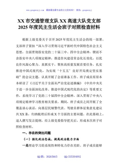 / XX市交通管理支队XX高速大队党支部2025年度民主生活会班子对照检查材料