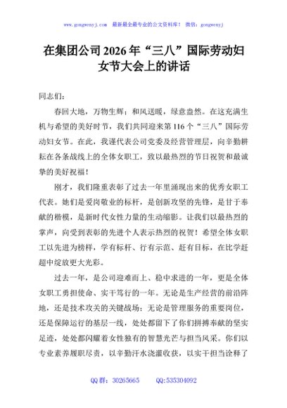 / 在集团公司2026年“三八”国际劳动妇女节大会上的讲话