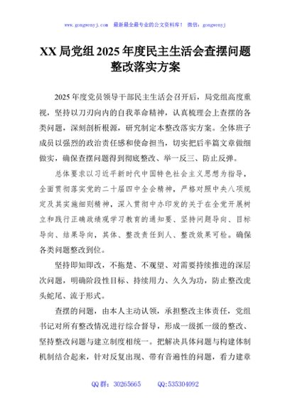 / XX局党组2025年度民主生活会查摆问题整改落实方案