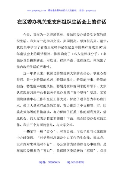 / 在区委办机关党支部组织生活会上的讲话