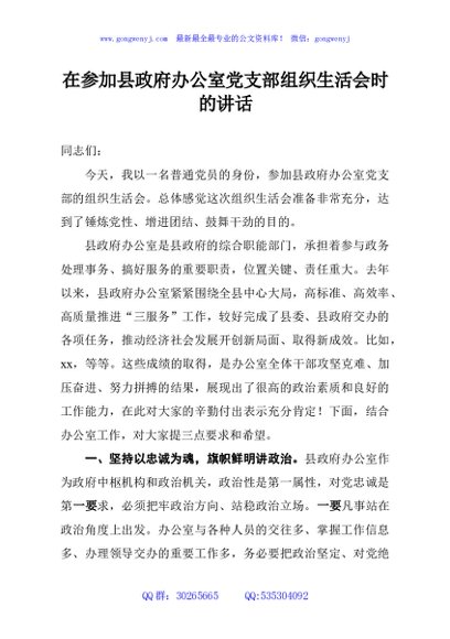 / 在参加县政府办公室党支部组织生活会时的讲话