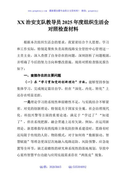 / XX治安支队教导员2025年度组织生活会对照检查材料