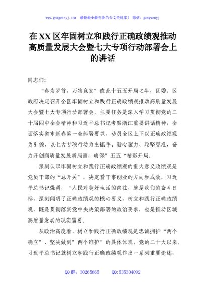 / 在XX区牢固树立和践行正确政绩观推动高质量发展大会暨七大专项行动部署会上的讲话