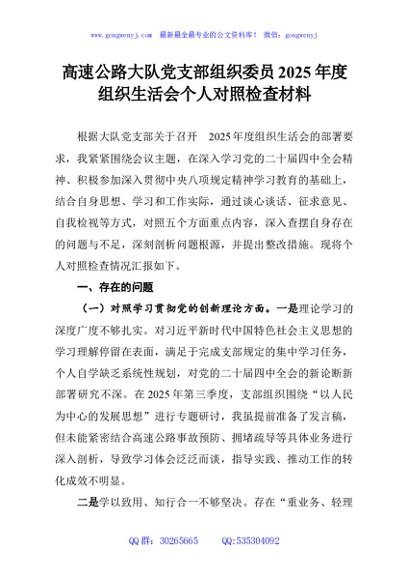 / 高速公路大队党支部组织委员2025年度组织生活会个人对照检查材料