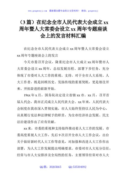 / (3篇)在纪念全市人民代表大会成立xx周年暨人大常委会设立xx周年专题座谈会上的发言材料汇编