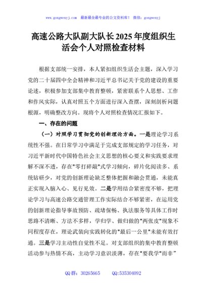 / 高速公路大队副大队长2025年度组织生活会个人对照检查材料