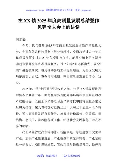 / 在XX镇2025年度高质量发展总结暨作风建设大会上的讲话