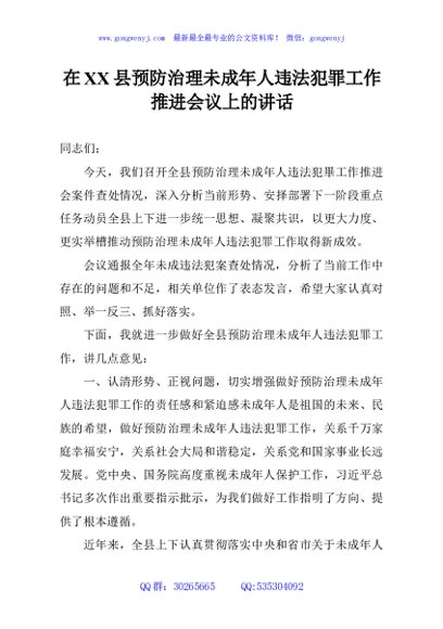 / 在XX县预防治理未成年人违法犯罪工作推进会议上的讲话