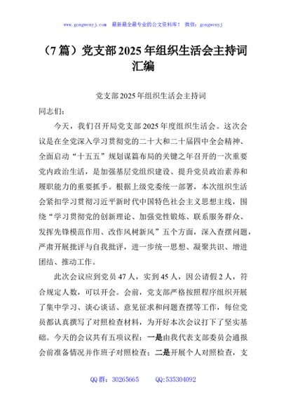 / (7篇)党支部2025年组织生活会主持词汇编