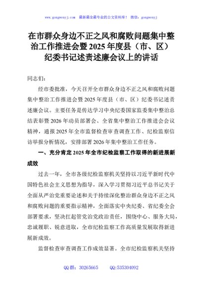 / 在市群众身边不正之风和腐败问题集中整治工作推进会暨2025年度县(市、区)纪委书记述责述廉会议上的讲话