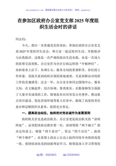 / 在参加区政府办公室党支部2025年度组织生活会时的讲话