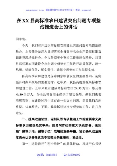 / 在XX县高标准农田建设突出问题专项整治推进会上的讲话
