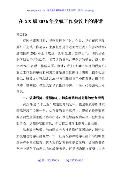 / 在XX镇2026年全镇工作会议上的讲话