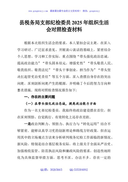 / 县税务局支部纪检委员2025年组织生活会对照检查材料
