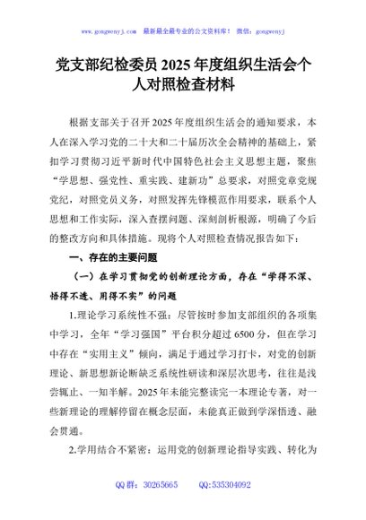 / 党支部纪检委员2025年度组织生活会个人对照检查材料