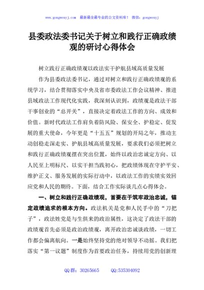 / 县委政法委书记关于树立和践行正确政绩观的研讨心得体会
