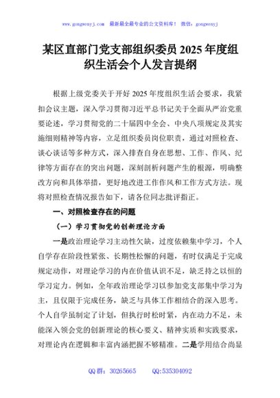 / 某区直部门党支部组织委员2025年度组织生活会个人发言提纲