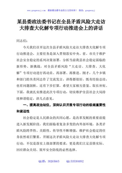 / 某县委政法委书记在全县矛盾风险大走访大排查大化解专项行动推进会上的讲话