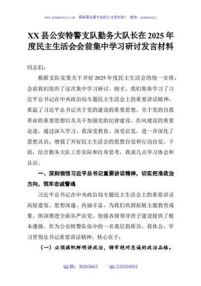 / XX县公安特警支队勤务大队长在2025年度民主生活会会前集中学习研讨发言材料