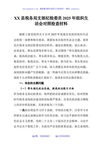 / XX县税务局支部纪检委员2025年组织生活会对照检查材料