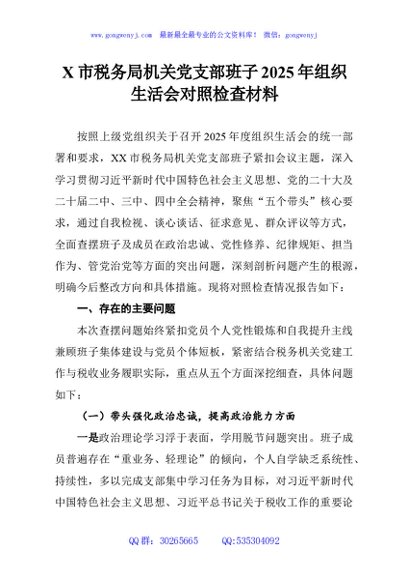 / X市税务局机关党支部班子2025年组织生活会对照检查材料