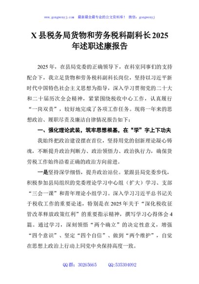 / X县税务局货物和劳务税科副科长2025年述职述廉报告